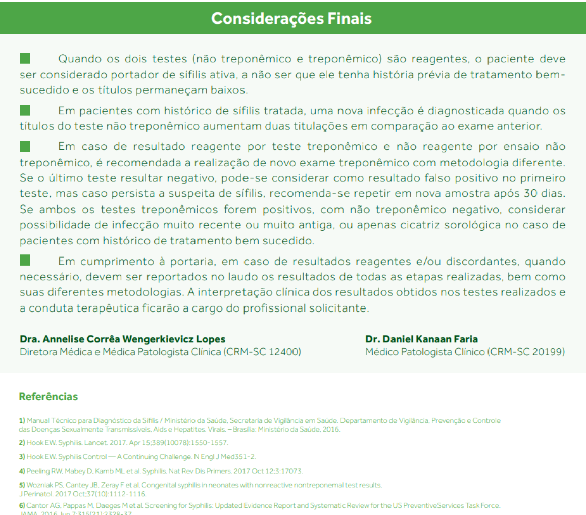 Para seguimento, os testes utilizados são do tipo não treponêmico e devem ser realizados mensalmente nas gestantes e a cada três meses na população geral (1º ano) e posteriormente a cada seis meses. É compatível com sucesso de tratamento a queda de duas diluições em três meses (ex: de 1:64 para 1:16) ou três diluições em seis meses (ex: de 1:64 para 1:8). A persistência de títulos baixos (1:1 até 1:4) é chamada memória sorológica e pode ocorrer em uma minoria de indivíduos, não significando falha de tratamento; caso haja elevação da titulação em dois títulos ou mais, deve-se considerar a possibilidade de reinfecção/reativação. Testes treponêmicos não devem ser utilizados para monitorização terapêutica, esperase que permaneçam reagentes pelo resto da vida. É importante que conste no pedido médico o dado de “controle de tratamento” para que seja realizado somente o teste não treponêmico