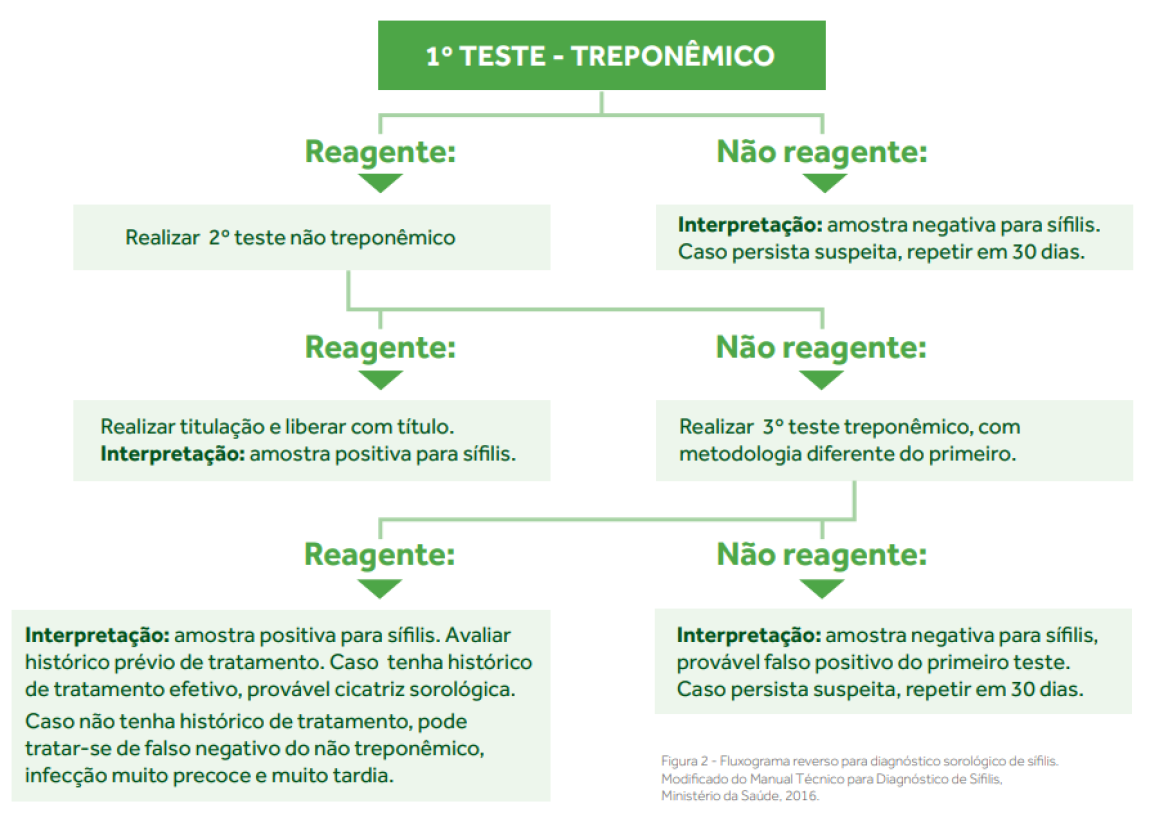 O Ministério da Saúde, por meio de Manual Técnico, recomenda a aplicação de algoritmos para o diagnóstico sorológico de sífilis, com uma combinação de teste treponêmico e não treponêmico aplicados à mesma amostra. A Figura 2 baseia-se no fluxograma reverso (fluxograma 2 do manual), indicado para serviços com boa infraestrutura de automação, por permitir a liberação rápida dos resultados e processamento de um grande número de amostras diariamente. O Manual Técnico para Diagnóstico da Sífilis pode ser consultado na íntegra em www.aids.gov.br
