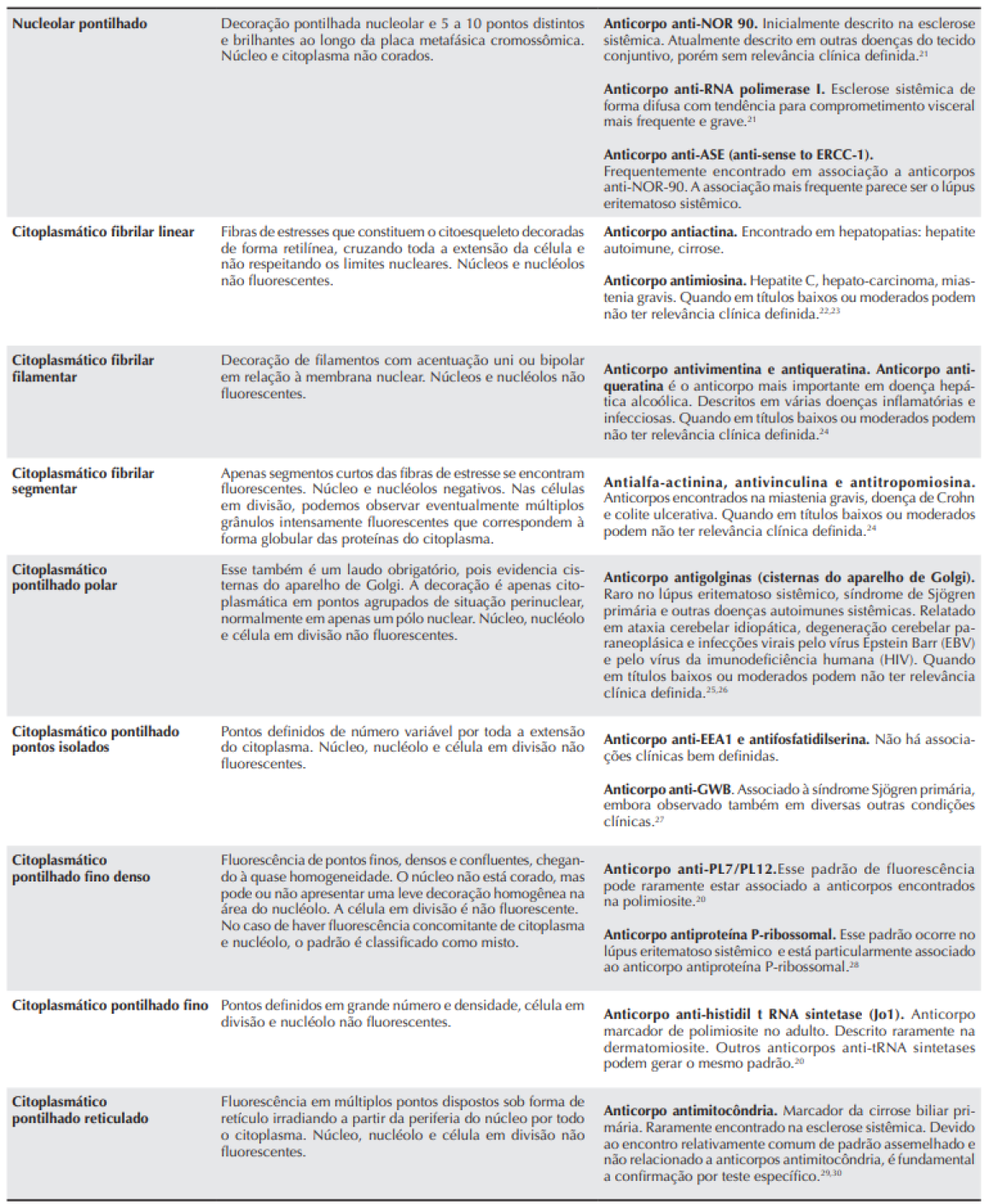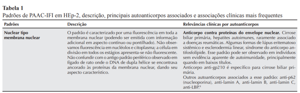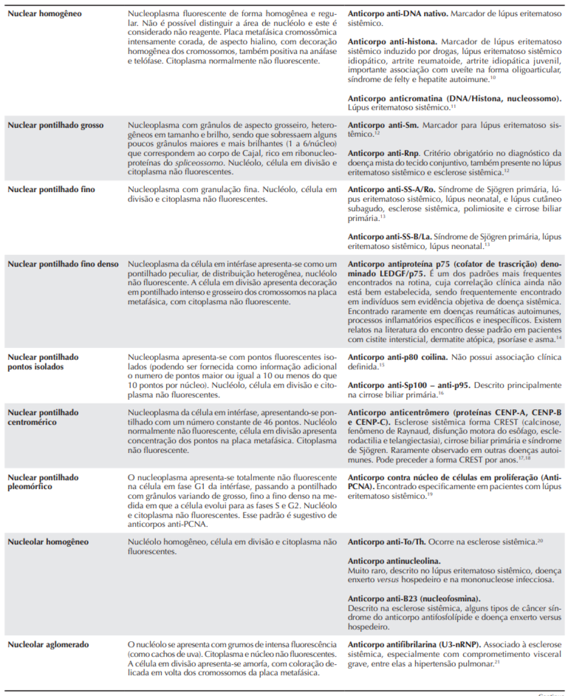 Os membros do Consenso procederam a uma ampla discussão para validação e reavaliação das associações clínicas e imunológicas referentes aos padrões de PAAC-IFI em HEp-2. As recomendações advindas dessa atividade estão listadas na Tabela 1